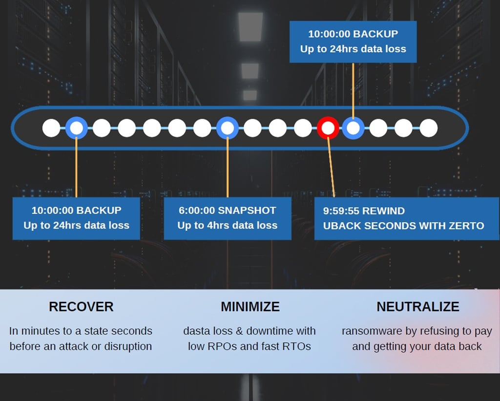 โซลูชัน Backup & DR ระดับสูงด้วยเทคโนโลยี Continuous Data Protection (CDP) สามารถกู้คืนระบบได้ฉับพลันในระดับวินาที (Rewind Seconds) มั่นใจได้ว่าธุรกิจจะไม่หยุดชะงักแม้โดน Ransomware